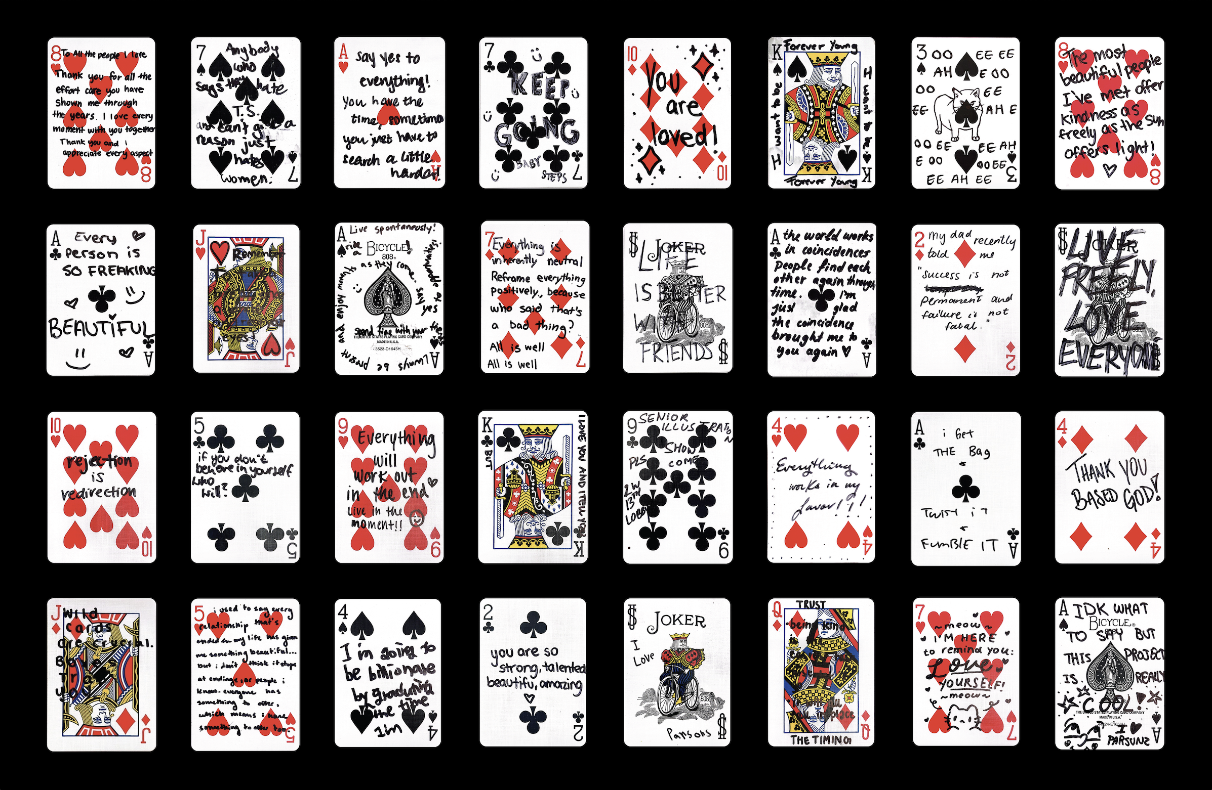 Love Anonymous is an archival project that collects and shares anonymous messages from people in New York City. After gathering these handwritten notes, I created a digital platform that preserves them as part of a growing online archive. Each message is written on a playing card, transforming a familiar and randomized object into something deeply personal. Each card is unique yet part of a larger system, the project highlights the diversity and individuality of these anonymous voices.