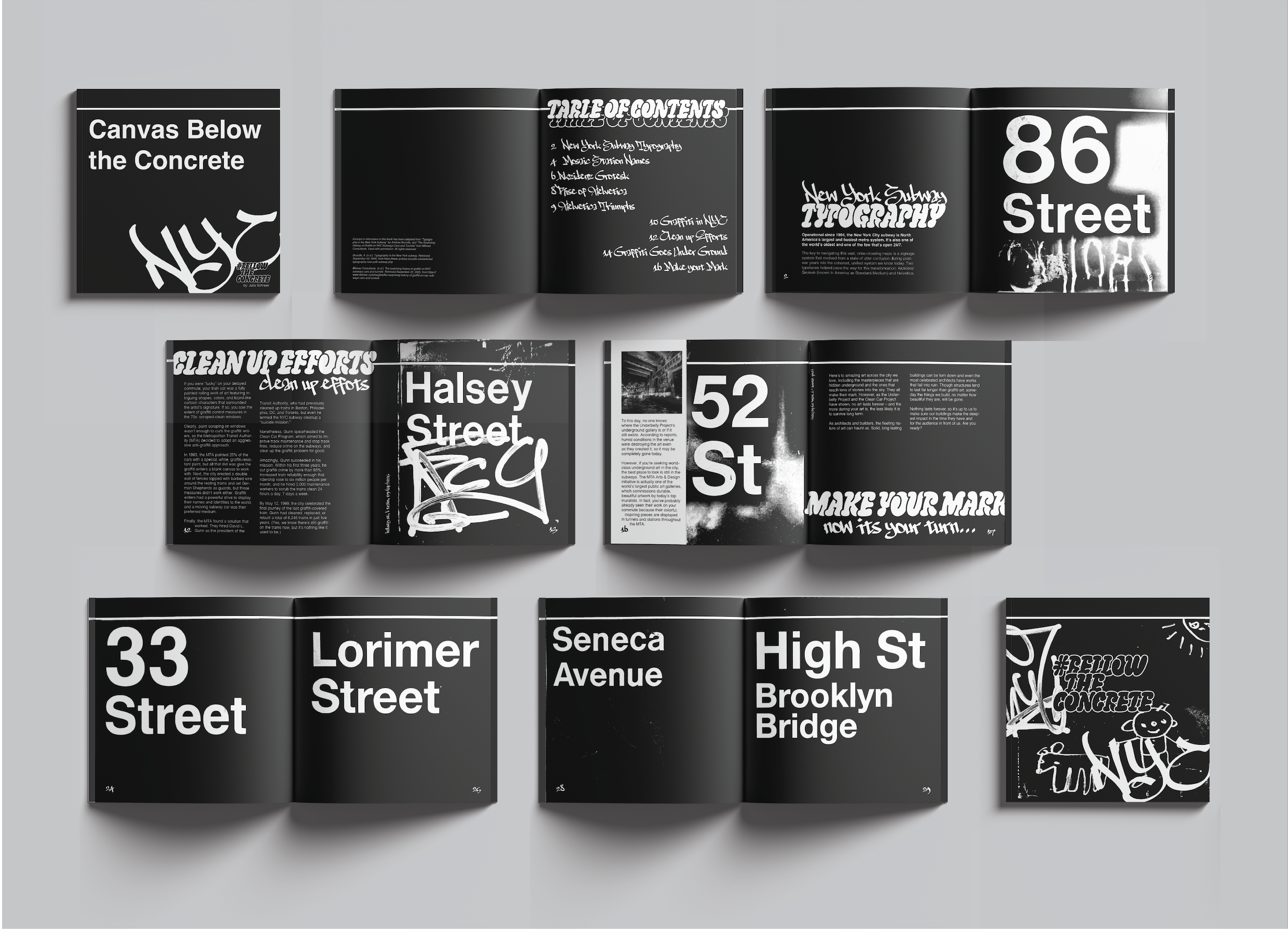 Using the visual language of NYC subway and graffiti culture I developed this conceptual publication, reframing subway signage and structural elements as hidden canvases for artistic expression. The project encourages New Yorkers to reconsider the subway as both functional infrastructure and creative surface.