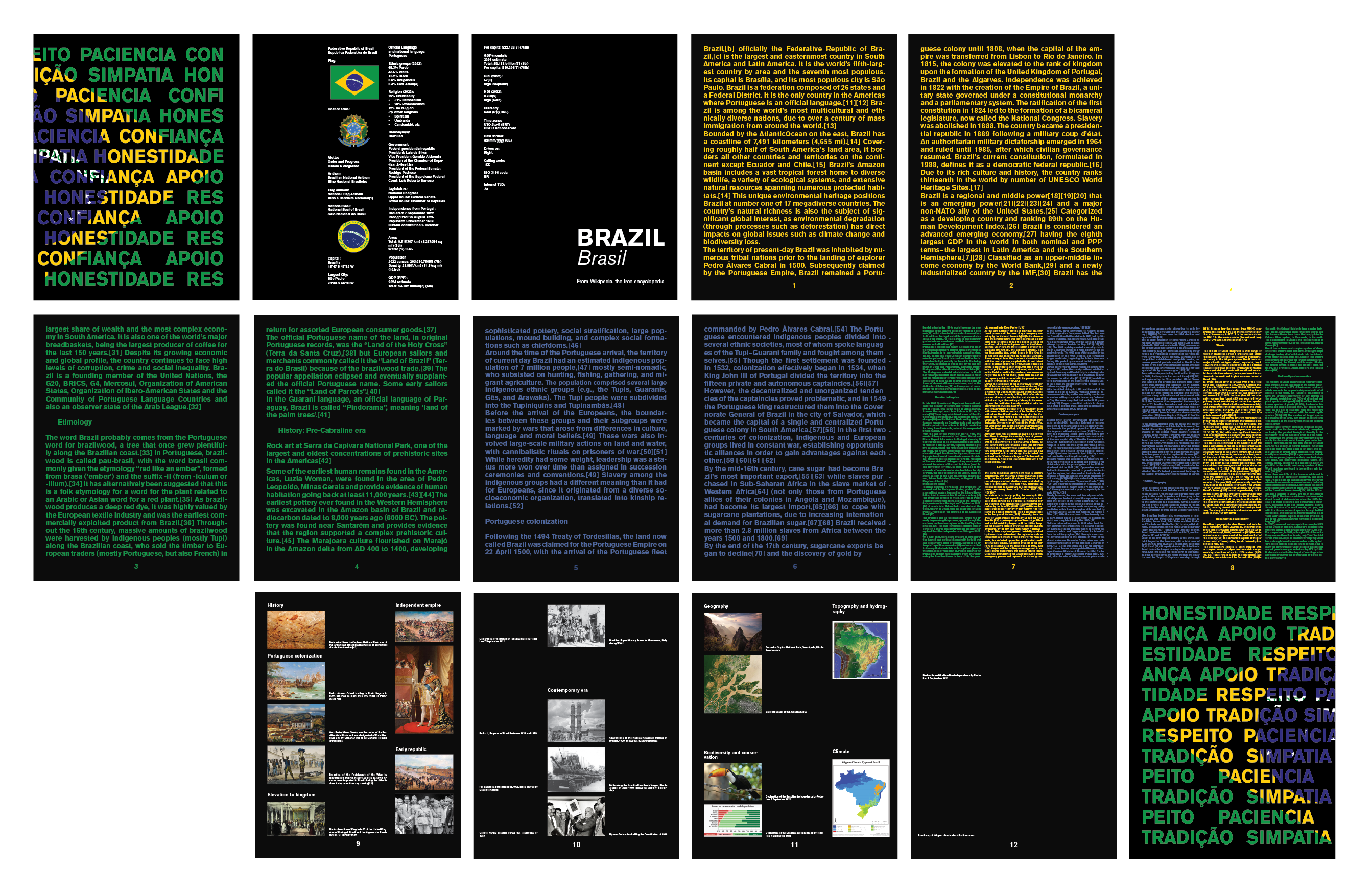Using Brazil’s Wikipedia entry, I selected the content for a conceptual book. The goal was to explore the process of translating information from a digital medium to a physical one, considering how meaning shifts when content is reinterpreted visually. I focused on the theme of “threes,” drawing inspiration from Brazil’s flag, which features three primary colors and geometric shapes. This concept was reflected in the book’s layout, color choices, and design elements, emphasizing the symbolic significance of the number three.